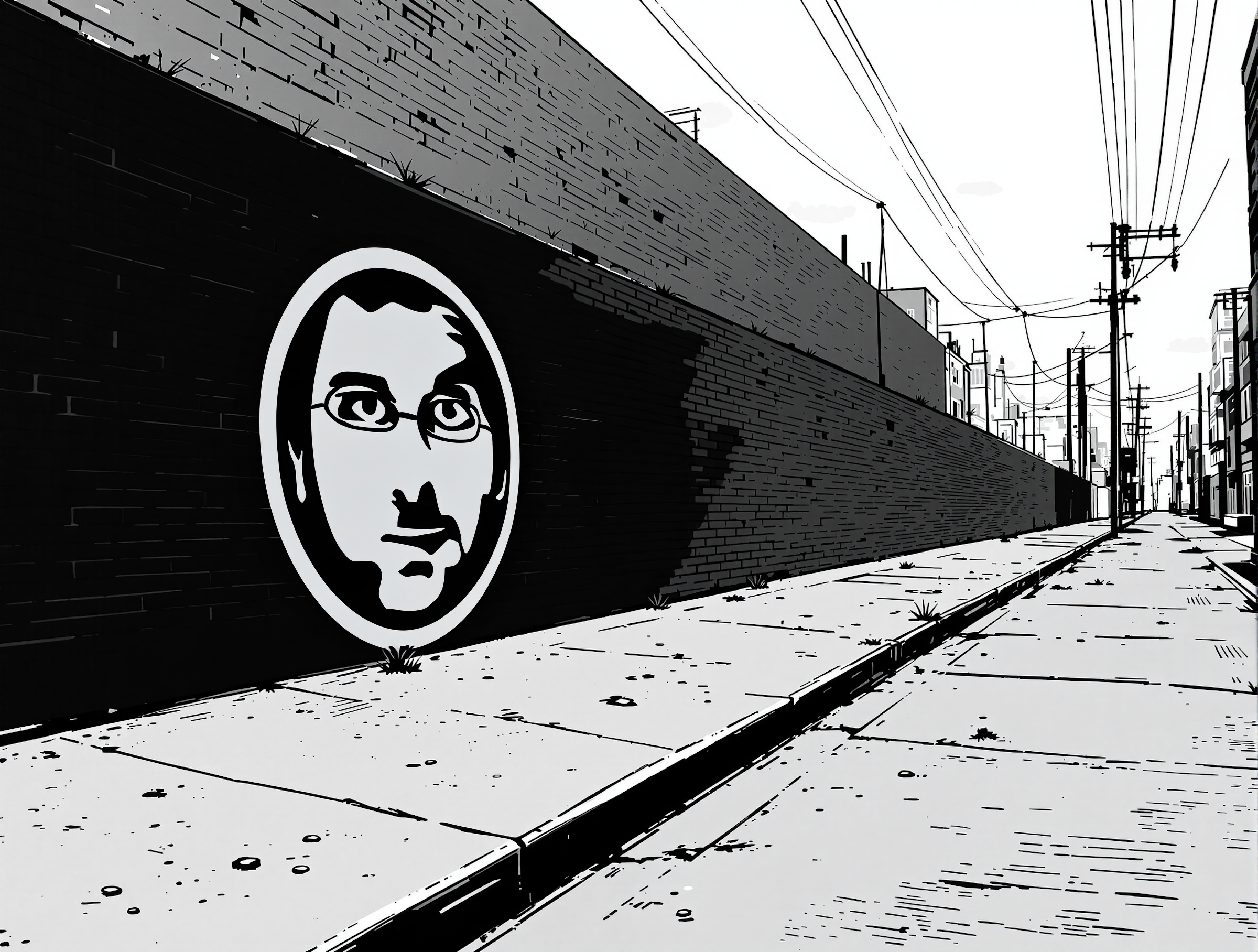 Black-and-white urban alley illustration with stylized faces on a brick wall, utility poles, and a cracked pavement.
